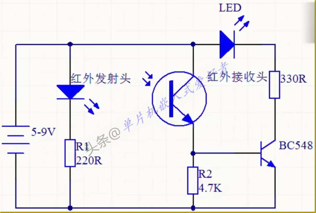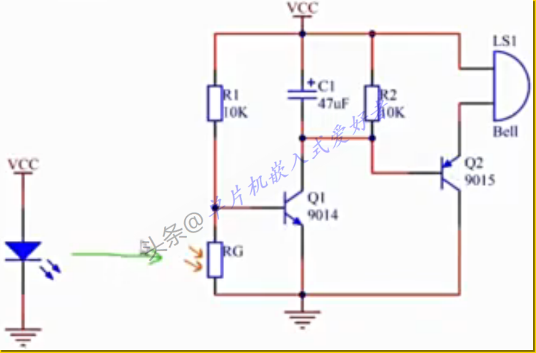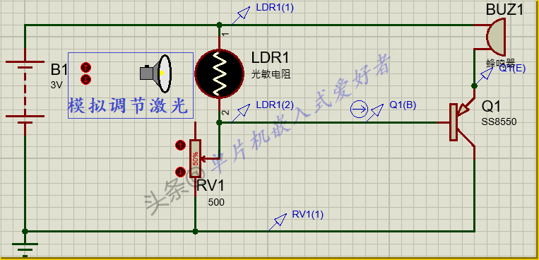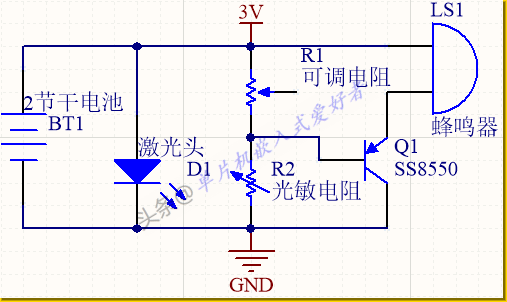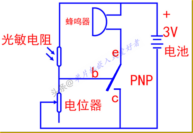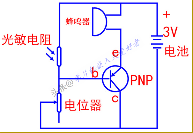 当有激光照射到光敏电阻上时,光敏电阻的阻值变小,电位器分压的压降超过0.7V,PNP三极管基极电压大于0.7V三极管不导通,蜂鸣器不响;当有人挡住照射到光敏电阻上的激光时,光敏电阻阻值变大,电位器分压的压降小于0.7V,PNP三极管基极小于0.7V三极管导通,蜂鸣器接通到电池,蜂鸣器响。其实对于上图,可以这样理解,将NPN三级管看成一个开关,通过b点的电压控制开关的通断。