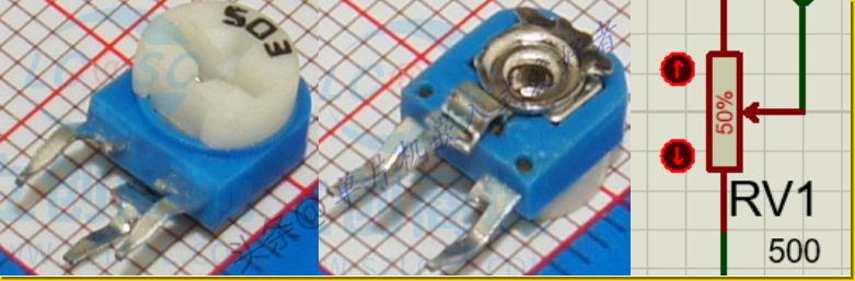 可调电阻有3个脚,使用时一般接中间一个脚和另外一个脚,实物图和电路中的符号图表示如下: