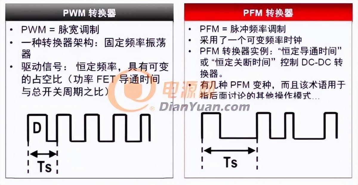 PWM是频率的宽和窄的变化,PFM是频率的有和无的变化, PWM是利用波脉冲宽度控制输出,PFM是利用脉冲的有无控制输出.