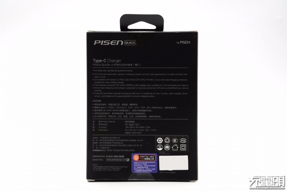 包装盒主体黑色配色,正面印有PISEN品牌、充电器外观图以及卖点标识。