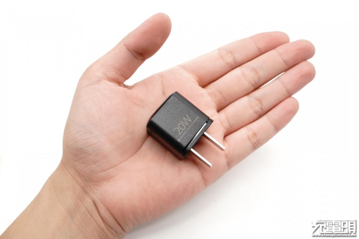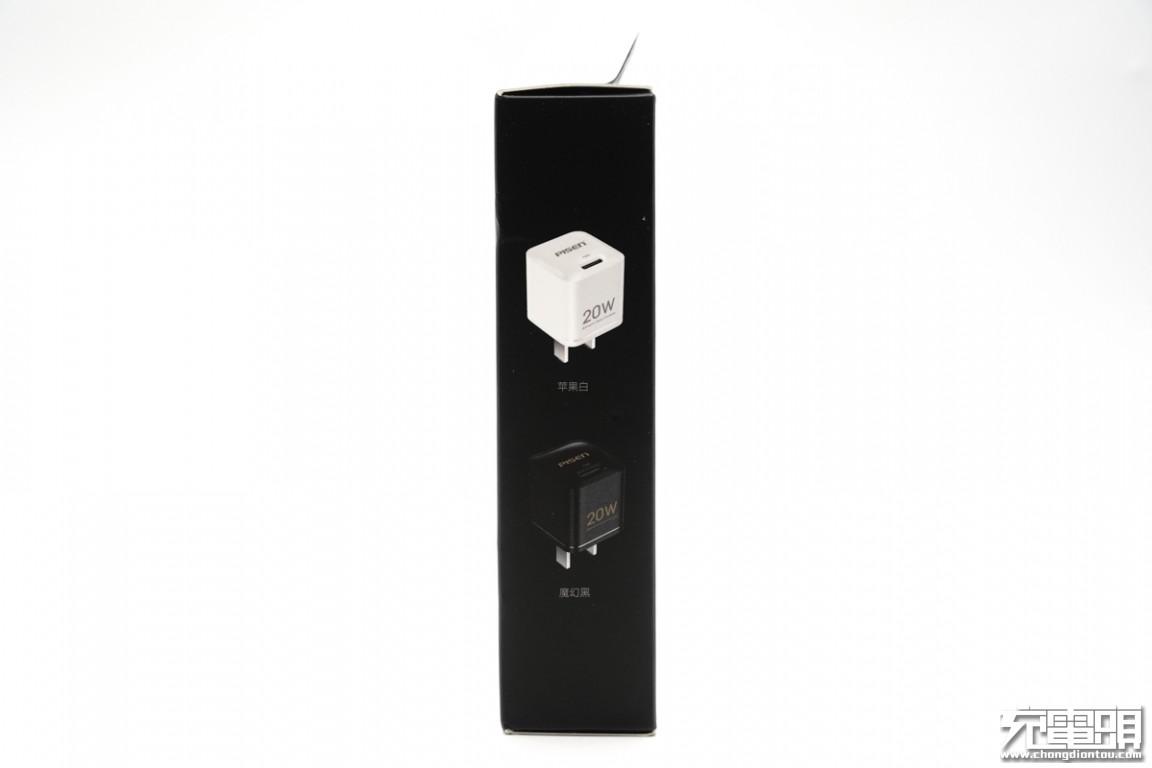 品胜20W充电器采用小方块造型设计,腰身哑光处理,输出顶面微凸,并且采用亮面设计,腰身一面上印有20W快充字样。