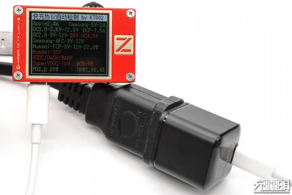 使用ChargerLAB POWER-Z KT002检测USB-C口输出协议,显示支持Apple 2.4A、Samsung 5V2A、DCP协议,以及QC2.0/3.0、AFC、FCP、PD3.0快充协议。