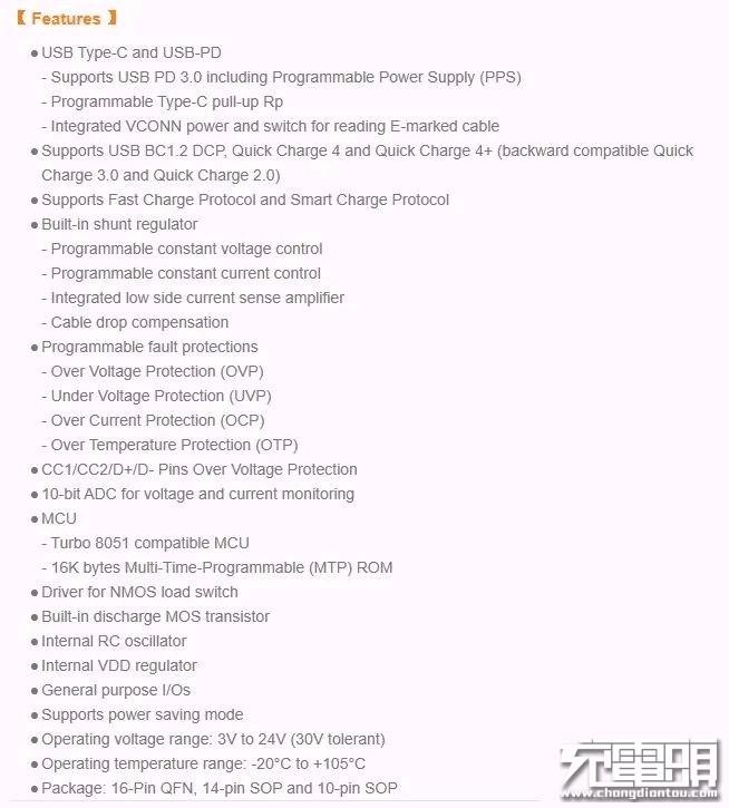 支持USB PD3.0和PPS,内置可编程的恒压恒流控制,集成低侧电流采样放大器,支持线损补偿,支持多重保护功能,包括数据线的过压保护,内部集成10bit ADC用于电压和电流检测,内置8051内核单片机,内置放电MOS管。
