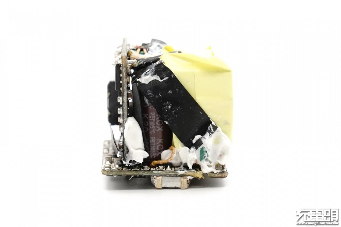 输入端一览,共模电感打胶固定,高压滤波电解电容夹在小板和变压器之间。