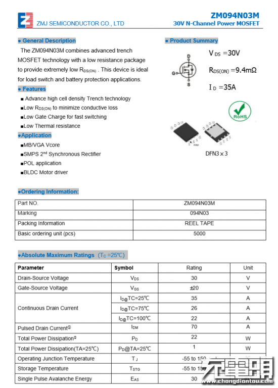 输出VBUS开关采用真茂佳ZM094N03M,NMOS,耐压30V,导阻9.4mΩ。
