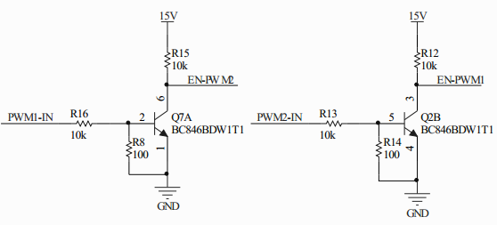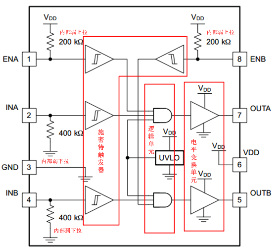 电平转换,PWM1-IN — PWM1,只要VDD引脚供电如15V,那么当PWM1-IN和ENA输入有效时,输出电平是15V。同样PWM2-IN — PWM2,一样的道理。