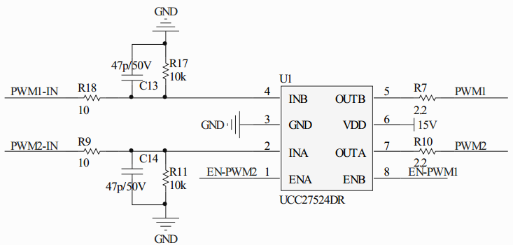 上面就是通过UCC27524使能端以及电平转换单元实现的互锁和电平转换功能。
