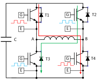 如下图是常见的H桥电路(或称为全桥电路拓扑),"T1"和"T3"上管和下管结构称为半桥结构,控制中要求上管和下管驱动信号互补;"T2"和"T4"同样也是一个半桥结构,驱动控制信号同样也是互补。整个H桥"T1"和"T4"驱动信号相同,"T2"和"T4"驱动信号相同,"T1、T4"和"T2、T3"驱动信号互补。