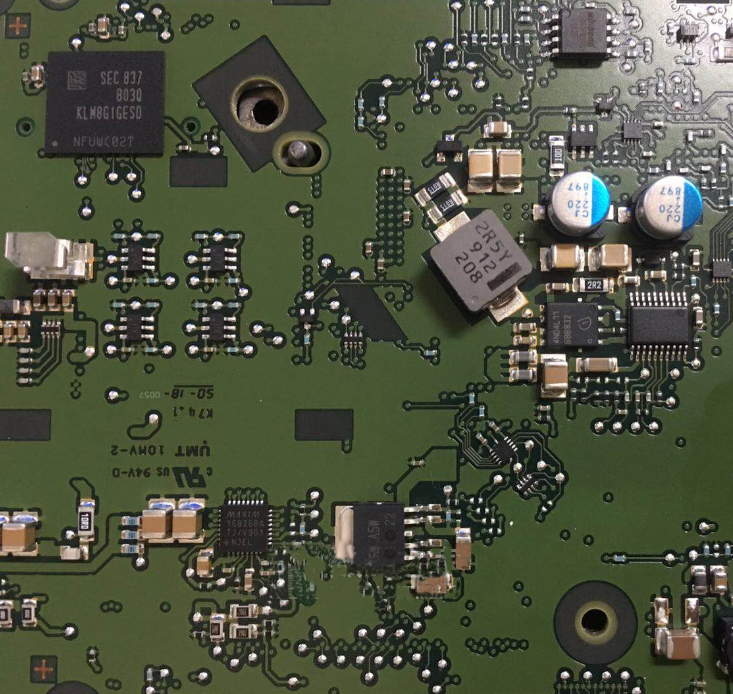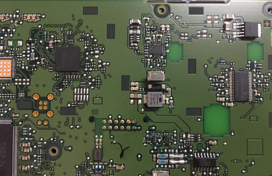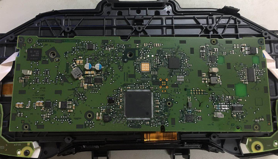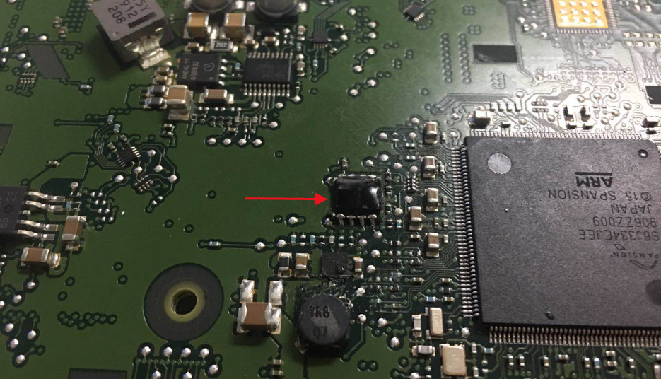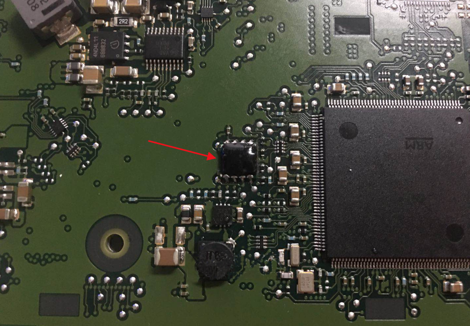 眼尖一些的人应该看到有异常的位置了,就在红箭头位置,这个位置原本就是35128芯片的位置,由于已经被调过了,所以现在看到的是焊上了模拟芯片了,手工烂焊得太丑,如果细心点的话可以以假乱真,小白都很难看出仪表被动过手脚。