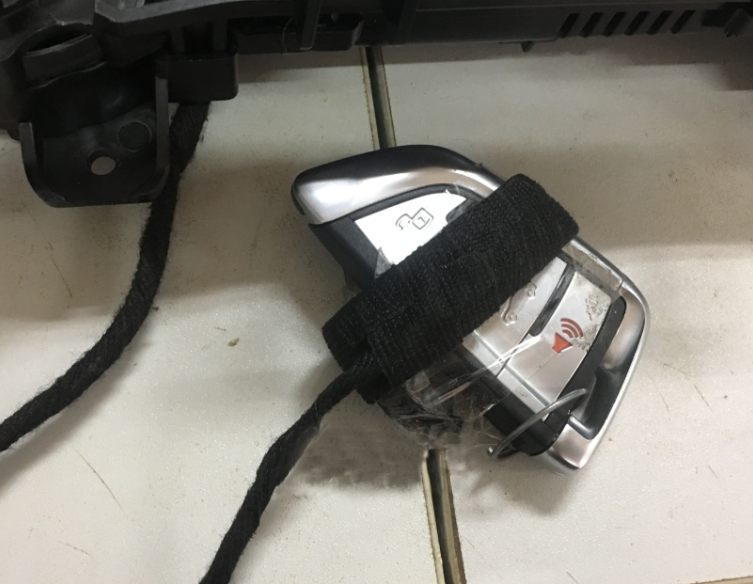 再看看线束,包含两个大接头,已经插上了,还有一个钥匙线圈,用于感应车钥匙,BDC要检测到钥匙和自身是配套的才能启动,还有一个小按钮,用来模拟车上的电门开关,也就是一键启动按钮,最后有一个电源输入接口,需要外接12V直流电。
