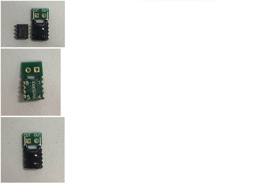 现在有了芯片模拟器,就是完全模拟一片35xxx芯片,将原车35xxx的数据和ID编号用编程器读出,然后将数据和ID写入模拟芯片内并修改里程为任意想要的数值,最后将模拟芯片焊接回仪表内,由于是完全模拟,仪表读取到的数据和ID号都是和原车芯片一致,所以愚蠢的仪表就被轻易的欺骗了。下面就是所谓的模拟芯片,如下图,一个小玩意,左边是常规芯片,右边是模拟芯片,大小差不多,但是模拟芯片长度大一些,不过多出来的长度是没用的,只是为了方便手拿而已,在模拟芯片焊到车上之前要用钳沿着CUT箭头指示的位置剪断多余的部分,剪完后大小就跟常规SOP-8芯片差不多了,可以直接焊接到原车芯片位置。