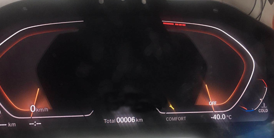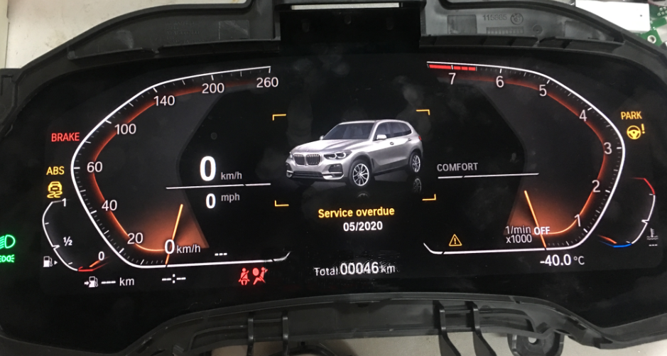 最后接上12V电源,启动一下,看看效果很酷,由于这个图是后排的,已经调过了,所以当前显示46KM,说一下,BMW的里程是有一个算法的,写入的值最终显示到仪表是有一点点误差的,比如这个46KM实际调表调的是50KM,不过差个几公里无所谓!