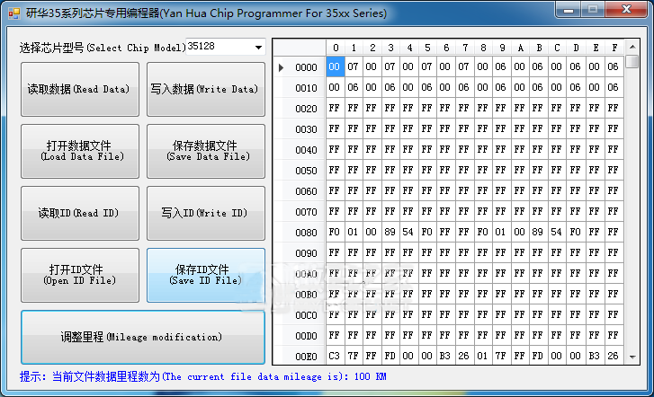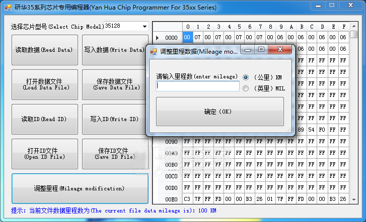 然后继续在软件上操作第一步,点打开数据文件,打开刚才读取的数据,此时软件底部会显示当前数据对应的公里数第二步,点调整里程,在对话框内输入要调整的公里数,可以选择公里还是英里,对应国内车型和国外车型单位第三步,点击写入数据,等待写入完成,大概半分钟第四步,点击打开ID文件,打开刚才备份好的原车ID文件第五步,点击写入ID,将ID写入模拟芯片内,完成后,模拟芯片就可以以假乱真了