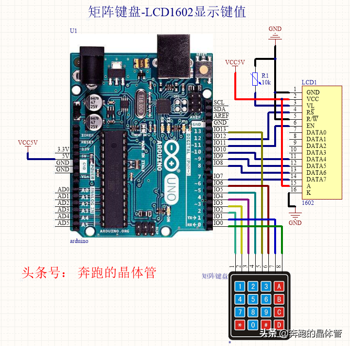 下面通过Arduino连接矩阵键盘和1602液晶,把键盘按下键值在液晶上显示出来,原理图的连接如下图.
