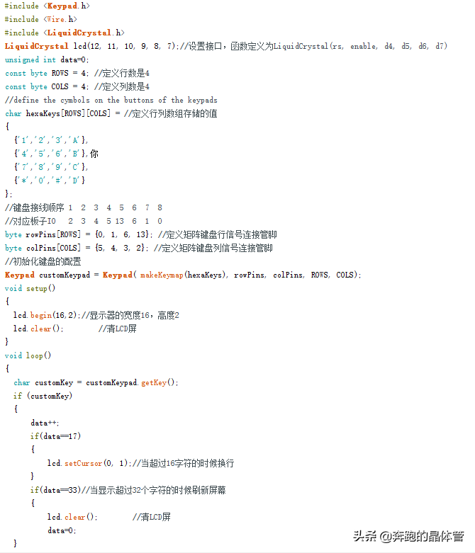Arduino的矩阵键盘的驱动的是库函数的形式,直接调用库的键盘配置函数和扫描函数,对键盘识别,所以Arduino的库函数使用起来还是挺方便的。