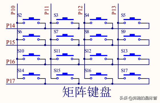 简单介绍一下矩阵键盘,实际应用中,正常一个按键需要占用一个IO,我们为了节省IO资源,于是把多个按键做成矩阵键盘的形式。如一个4x4的矩阵键盘,只需要8个IO口就可以了,每个按键有它的行值和列值,行值和列值的组合就是识别这个按键的编码。