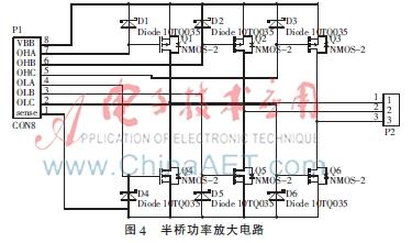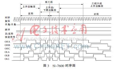 图3所示的时序图包括让电机工作在单三拍(2-phase excation)模式和三相六拍(2-3phase excitation)模式。输出信号OHA、OHB、OHC、OLA、OLB、OLC六路信号输送到分立元件功率放大电路。