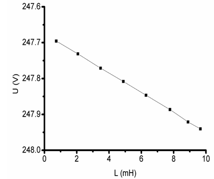 交流稳压电源的实际应用中,负载阻抗的表现为感性的情况较多。当负载阻抗存在感性阻抗时,交流输出电压值相应的产生变化。在交流稳压电源主回路其他元件参数不发生变化时,输出电压随感性负载的增大,呈现减小的趋势,如图9所示。