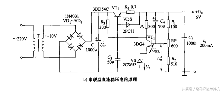 从下图可以看出,变压器将220V降压为10V,经VD1~VD4桥式整流,交流10V变为脉动直流,经电容滤波,再经稳压、放大、取样环节,使调整管VT2工作,输出直流电为6V,调整取样电阻RP大小,就可使输出电压在6V以内变化,该电路输出电流为200毫安。