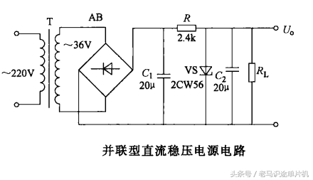 工作原理:下图为并联型直流稳压电源电路,220V电压经过变压器降压、全波桥式整流、电容滤波后,由稳压二极管稳压输出直流电压给负载,输出直流电压等于电源变压器二次电压的90%。该电路用于要求不高的场合。