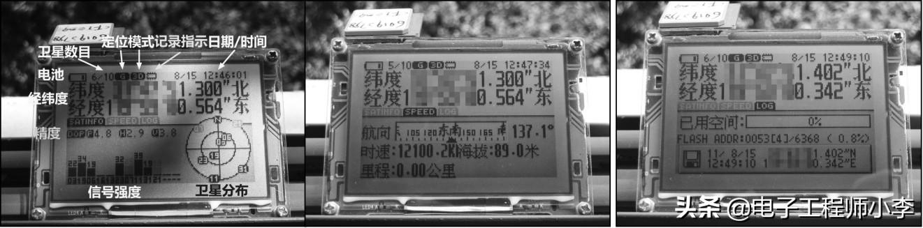 常规显示时屏幕分为3个区域,顶部显示电池电量、卫星信息、时间等,中间用大字体显示当前经纬度,下半屏则根据显示模式分别显示卫星信息、速度航向和记录信息3种模式。按“显示模式”按键可以在3种模式中循环切换,如图12.11所示。