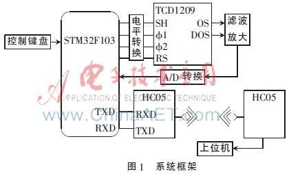 系统主要由ARM处理器STM32F103、电平转换、线阵CCD、滤波放大电路、A/D转换及蓝牙传输模块等组成。此图像采集系统的基本工作步骤是:首先微处理器芯片产生CCD所需要的4种驱动脉冲信号,使CCD能够正常工作,然后CCD的光敏单元部分采集到光信号,并且输出的是模拟信号,为了得到数字信号,必须经过放大处理然后输入到A/D转换当中,微处理器读取数字信号结果并且存入到自己的存储器当中,当这样一帧数据接收完成之后,经过串口将数据送入上位机当中处理[4]。系统框架如图1所示。