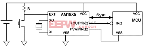 如图1所示,AM1815进入sleep模式的方式为MCU通过 SPI接口设置AM1815的sleep相关寄存器的值以使其进入sleep 模式,当AM1815进入sleep模式后,会将PSW/nIRQ2引脚电 平由低变为高,而AM1815的PSW/nIRQ2引脚接到MCU的 VSS,当其电平由低变高时,MCU从上电变为断电状态。 AM1815从sleep模式唤醒的方式为其EXTI引脚接收到一个上 升沿或者下降沿脉冲,这样PSW/nIRQ2引脚电平就会从高变 为低,从而MCU从断电变为上电状态。通过以上这种方式, 以AM1815的进入低功耗和唤醒来控制MCU的断电和上电。