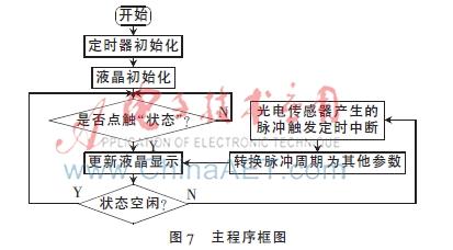 软件部分程序采用模块化的设计方法,主要是液晶显示程序、定时器中断测速程序和掉电存储程序,其中液晶显示程序包括定时中断计时程序、触点坐标判断程序以及预先设置的3个界面。