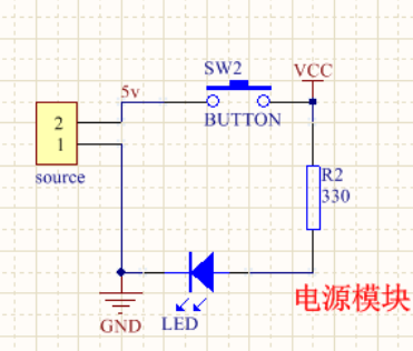 5v电源模块设置了开关和LED指示灯,其实就是一个串联电路。对于5v电源的选取,电脑USB,充电宝,手机适配器等都有5v电源输出,都可以作为电源。在原理图中,也可以并联电容滤波,这样可以避免电压扰动。在这设计中,对于电源的要求并不是很高,所以也可以不用。