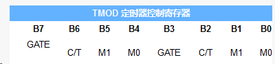 GATE :定时操作开关控制位,当GATE=1时,INT0或INT1引脚为高电平,同时TCON中的TR0或TR1控制位为1时,计时/计数器0或1才开始工作。若GATE=0,则只要将TR0或TR1控制位设为1,计时/计数器0或1就开始工作。