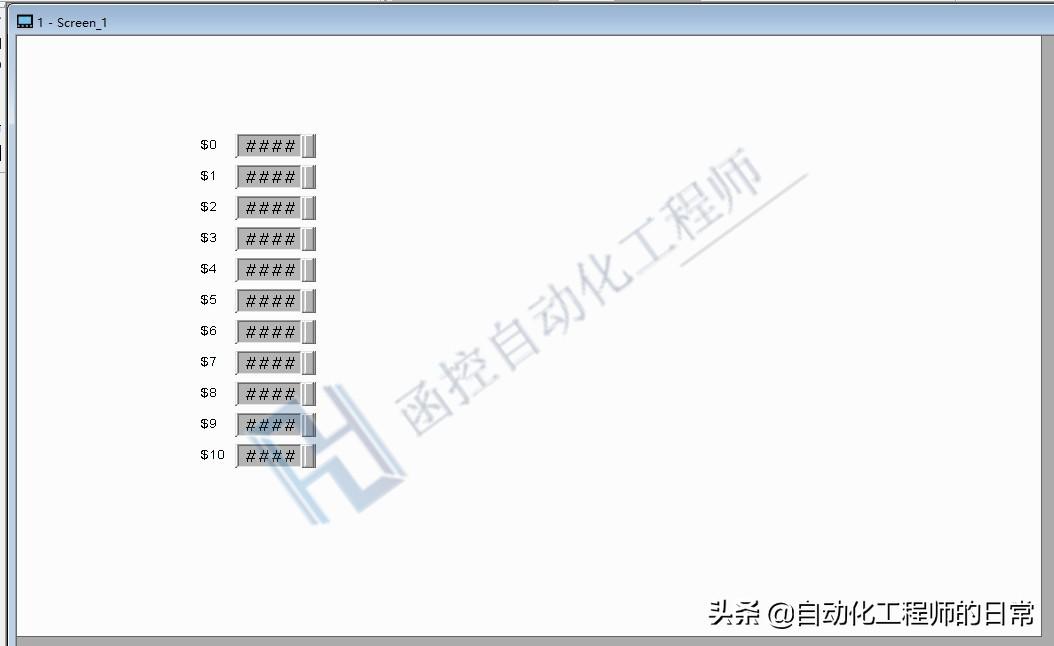 在画面编辑页面,按照下图所示,设置10个数值输入框。并将其地址设置为触摸屏内部存储区域的$0-$10。