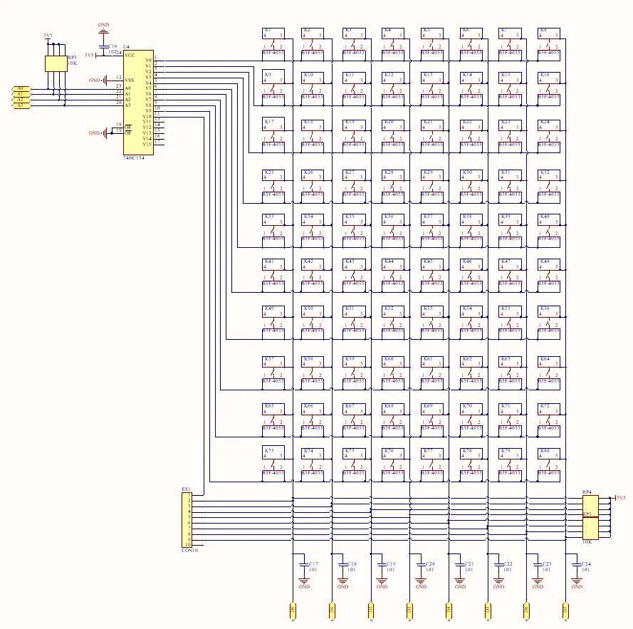主控采用GD32F303CC单片机,120MHZ主频,自带1个USBD接口,外加一个74HC154和单片机的8个IO输入组成11*8的88个按键扫描。如下图: