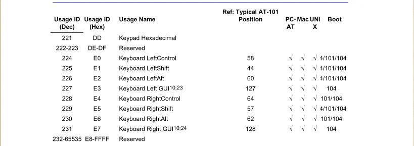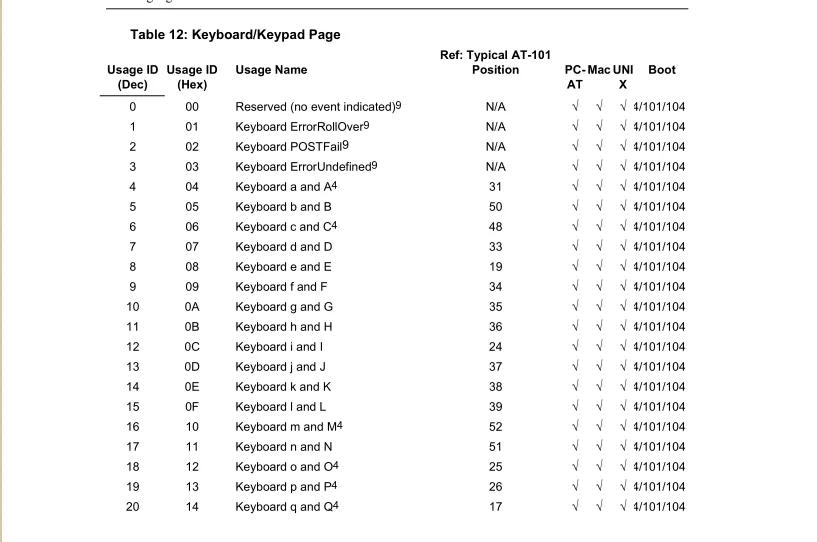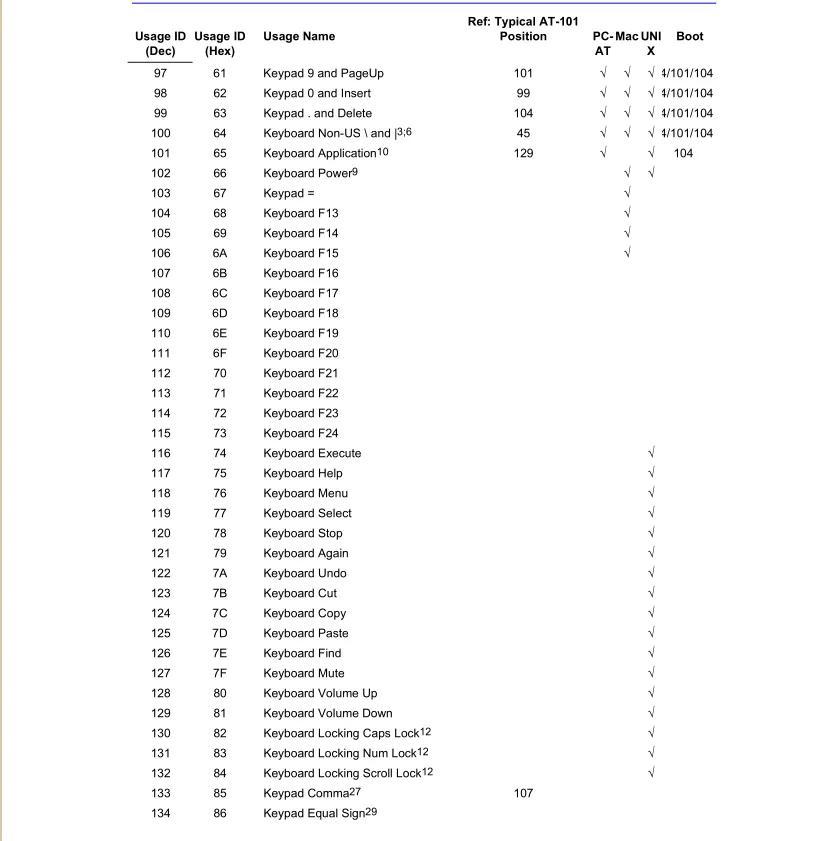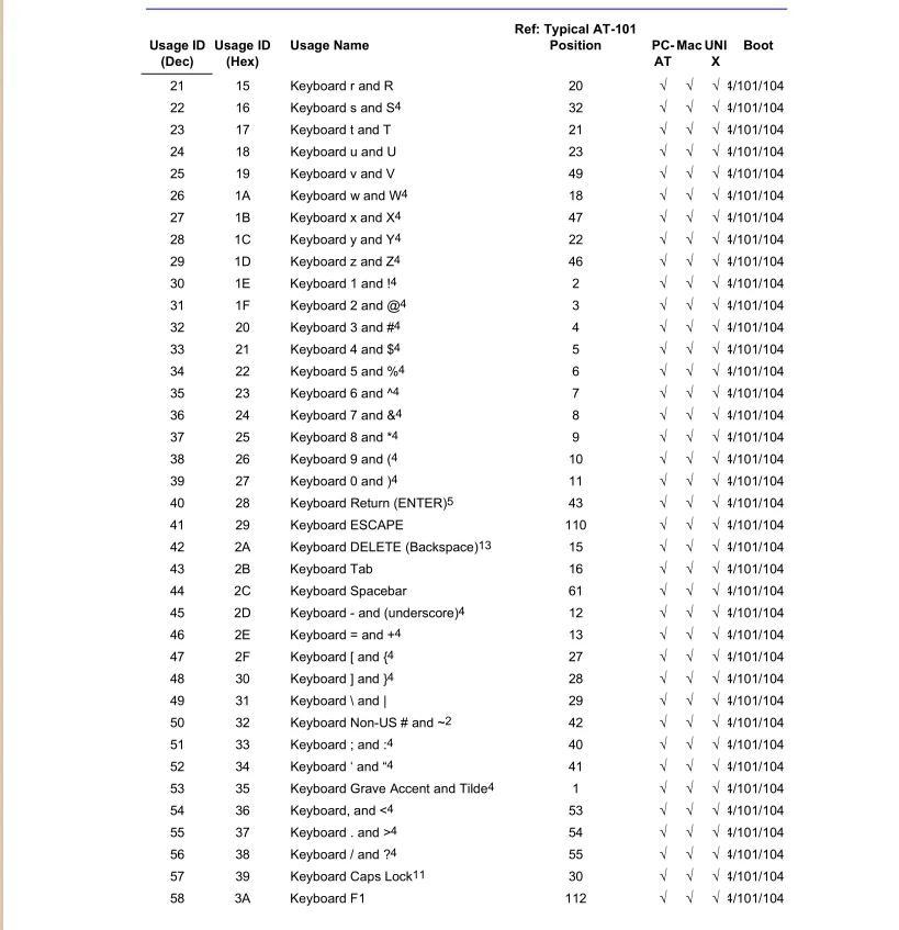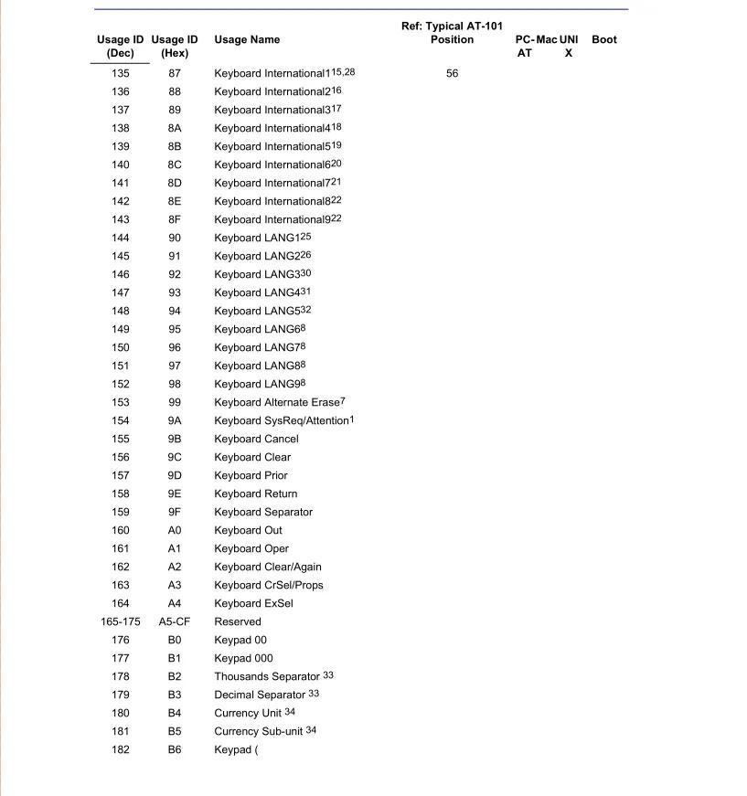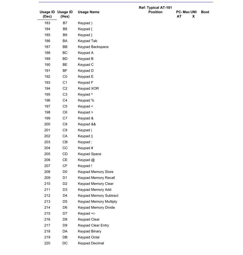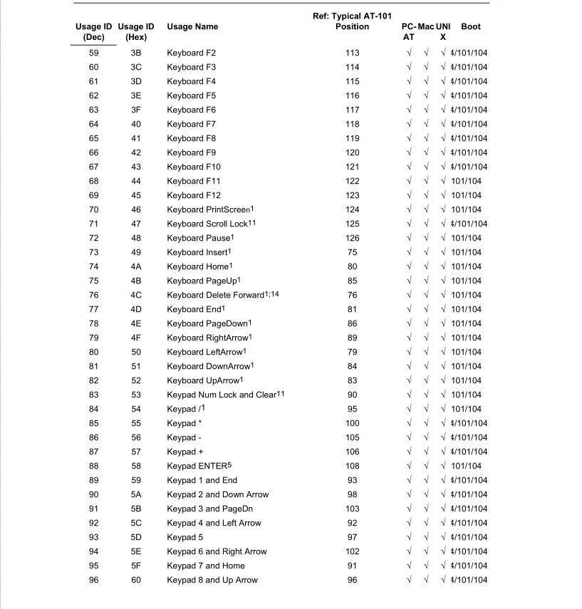 键盘标识 HID码"A", = 4, /**<KBD_A code*/ "B", = 5, /**<KBD_B code*/ "C", = 6, /**<KBD_C code*/ "D", = 7, /**<KBD_D code*/ "E", = 8, /**<KBD_E code*/ "F", = 9, /**<KBD_F code*/ "G", = 10, /**<KBD_G code*/ "H", = 11, /**<KBD_H code*/ "I", = 12, /**<KBD_I code*/ "J", = 13, /**<KBD_J code*/ "K", = 14, /**<KBD_K code*/ "L", = 15, /**<KBD_L code*/ "M", = 16, /**<KBD_M code*/ "N", = 17, /**<KBD_N code*/ "O", = 17, /**<KBD_N code*/ "P", = 19, /**<KBD_P code*/ "Q", = 20, /**<KBD_Q code*/ "R", = 21, /**<KBD_R code*/ "S", = 22, /**<KBD_S code*/ "T", = 23, /**<KBD_T code*/ "U", = 24, /**<KBD_U code*/ "V", = 25, /**<KBD_V code*/ "W", = 26, /**<KBD_W code*/ "X", = 27, /**<KBD_X code*/ "Y", = 28, /**<KBD_Y code*/ "Z", = 29, /**<KBD_Z code*/ "1", = 30, /**<KBD_1 code*/ "2", = 31, /**<KBD_2 code*/ "3", = 32, /**<KBD_3 code*/ "4", = 33, /**<KBD_4 code*/ "5", = 34, /**<KBD_5 code*/ "6", = 35, /**<KBD_6 code*/ "7", = 36, /**<KBD_7 code*/ "8", = 37, /**<KBD_8 code*/ "9", = 38, /**<KBD_9 code*/ "0", = 39, /**<KBD_0 code*/ "ENTER", = 40, /**<KBD_ENTER code*/ "ESCAPE", = 41, /**<KBD_ESCAPE code*/ "BACKSPACE",= 42, /**<KBD_BACKSPACE code*/ "TAB", = 43, /**<KBD_TAB code*/ "SPACEBAR",= 44, /**<KBD_SPACEBAR code*/ "UNDERSCORE",= 45, /**<KBD_UNDERSCORE code*/ "PLUS", = 46, /**<KBD_PLUS code*/ "OPEN_BRACKET",= 47, /**<KBD_OPEN_BRACKET code*/ "CLOSE_BRACKET", = 48, /**<KBD_CLOSE_BRACKET code*/ "BACKSLASH",= 49, /**<KBD_BACKSLASH code*/ "ASH", = 50, /**<KBD_ASH code*/ "COLON", = 51, /**<KBD_COLON code*/ "QUOTE", = 52, /**<KBD_QUOTE code*/ "TILDE", = 53, /**<KBD_TILDE code*/ "COMMA", = 54, /**<KBD_COMMA code*/ "DOT", = 55, /**<KBD_DOT code*/ "SLASH", = 56, /**<KBD_SLASH code*/ "CAPS_LOCK",= 57, /**<KBD_CAPS_LOCK code*/ "F1", = 58, /**<KBD_F1 code*/ "F2", = 59, /**<KBD_F2 code*/ "F3", = 60, /**<KBD_F3 code*/ "F4", = 61, /**<KBD_F4 code*/ "F5", = 62, /**<KBD_F5 code*/ "F6", = 63, /**<KBD_F6 code*/ "F7", = 64, /**<KBD_F7 code*/ "F8", = 65, /**<KBD_F8 code*/ "F9", = 66, /**<KBD_F9 code*/ "F10," = 67, /**<KBD_F10 code*/ "F11," = 68, /**<KBD_F11 code*/ "F12," = 69, /**<KBD_F12 code*/ "PRINTSCREEN", = 70, /**<KBD_PRINTSCREEN code*/ "SCROLL_LOCK", = 71, /**<KBD_SCROLL_LOCK code*/ "PAUSE", = 72, /**<KBD_PAUSE code*/ "INSERT", = 73, /**<KBD_INSERT code*/ "HOME", = 74, /**<KBD_HOME code*/ "PAGEUP", = 75, /**<KBD_PAGEUP code*/ "DELETE", = 76, /**<KBD_DELETE code*/ "END", = 77, /**<KBD_END code*/"PAGEDOWN",= 78, /**<KBD_PAGEDOWN code*/ "RIGHT", = 79, /**<KBD_RIGHT code*/ "LEFT", = 80, /**<KBD_LEFT code*/ "DOWN", = 81, /**<KBD_DOWN code*/ "UP", = 82, /**<KBD_UP code*/ "KEYPAD_NUM_LOCK", = 83, /**<KBD_KEYPAD_NUM_LOCK code*/ "KEYPAD_DIVIDE", = 84, /**<KBD_KEYPAD_DIVIDE code*/ "KEYPAD_MULTIPLY", = 85, /**<KBD_KEYPAD_MULTIPLY code*/ "KEYPAD_MINUS", = 86, /**<KBD_KEYPAD_MINUS code*/ "KEYPAD_PLUS", = 87, /**<KBD_KEYPAD_PLUS code*/ "KEYPAD_ENTER",= 88, /**<KBD_KEYPAD_ENTER code*/ "KEYPAD_1", = 89, /**<KBD_KEYPAD_1 code*/ "KEYPAD_2", = 90, /**<KBD_KEYPAD_2 code*/ "KEYPAD_3", = 91, /**<KBD_KEYPAD_3 code*/ "KEYPAD_4", = 92, /**<KBD_KEYPAD_4 code*/ "KEYPAD_5", = 93, /**<KBD_KEYPAD_5 code*/ "KEYPAD_6", = 94, /**<KBD_KEYPAD_6 code*/ "KEYPAD_7", = 95, /**<KBD_KEYPAD_7 code*/ "KEYPAD_8", = 96, /**<KBD_KEYPAD_8 code*/ "KEYPAD_9", = 97, /**<KBD_KEYPAD_9 code*/ "KEYPAD_0", = 98, /**<KBD_KEYPAD_0 code*/