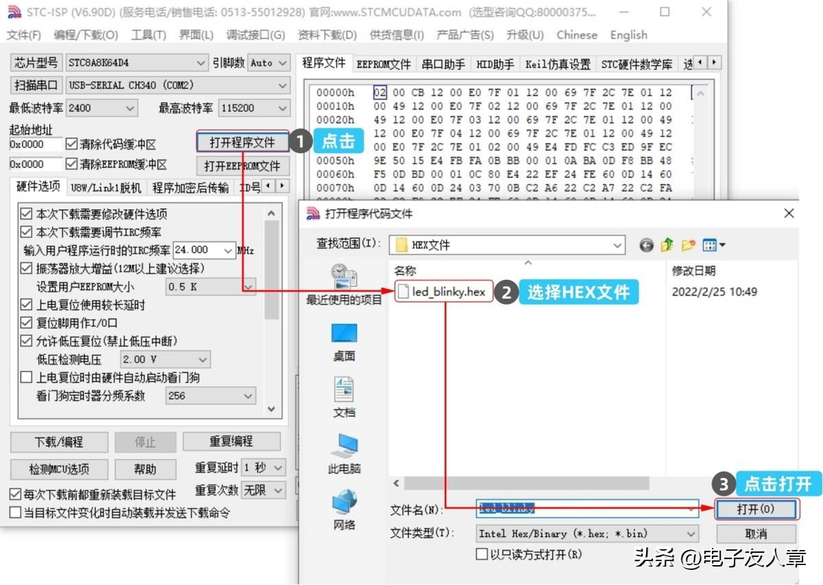 打开待下载的HEX文件。如下图所示,点击“打开程序文件”按钮,在弹出的窗口中导航到HEX文件目录,选中HEX文件后打开即可。