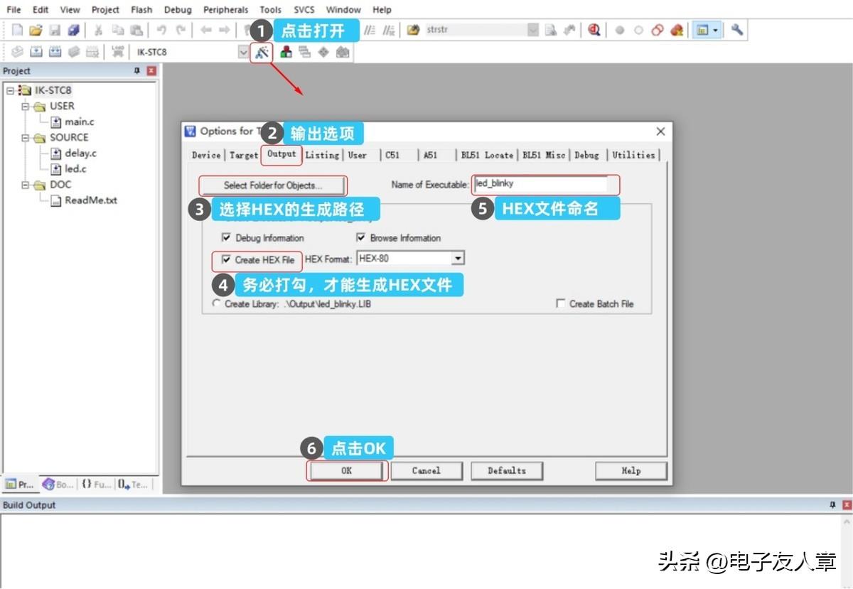 根据下面操作进入HEX文件的生成配置界面,如下图所示步骤操作。图5:配置Keil C51选项生成HEX文件