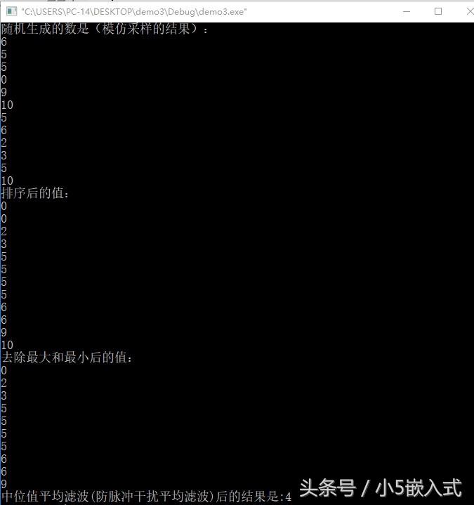 对某一个参数连续采样N次(一般为奇数),然后将数据从小到大的排列,再取中间值作为采样值,整个过程其实就是一个序列排序的过程。