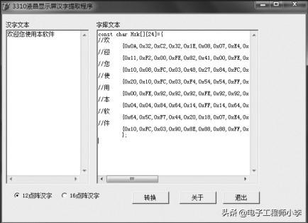 这里向大家介绍一款不错的字模软件——3310液晶显示屏汉字提取程序,其界面如图23.5所示,该软件可以很方便地制作出12像素×12像素与16像素×16像素大小的汉字字库。如果用户需要制作其他格式的字库,可以使用Zimo21软件,该软件功能强大,除了制作字库,还可以生成图片的HEX代码。