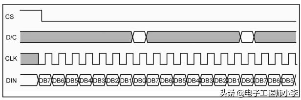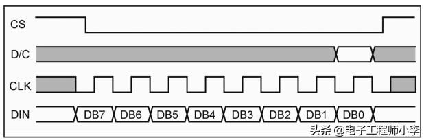 Nokia 5110 液晶屏的驱动程序包括初始化、清屏、显示字符、显示汉字、显示图形等函数,用户也可以根据需要开发新的接口程序。首先来看一下Nokia 5110液晶屏的时序图(见图23.3),在CS片选线的低电平有效期间发送数据,图中用圆圈标注的地方表示上升沿传输数据或者指令,传输数据高电平在先、低电平在后。串行总线发送多个字节的时序图,如图23.4所示。