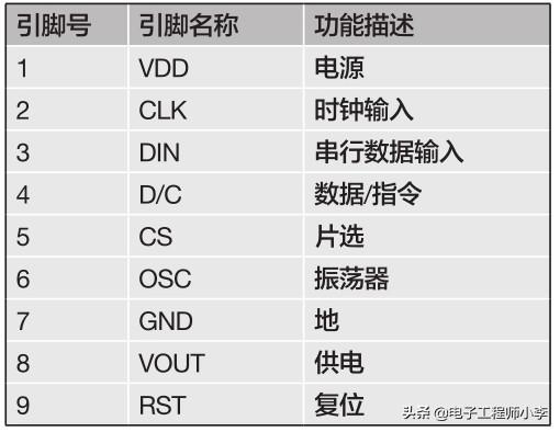Nokia 5110液晶屏共有9个引脚,除去电源和地,通信引脚只有5个,功能如表23.1所示。CLK为时钟输入引脚,最高输入频率为4MHz;DIN为串行数据输入引脚,在时钟的上升沿传输;D/C为数据和指令切换引脚,高电平发送数据,低电平发送控制指令;CS为片选引脚,低电平有效;OSC为振荡器引脚,如果使用内部振荡器,需要将该引脚接高电平,如果使用外部振荡器,则直接将该引脚连接外部晶体振荡器;VOUT为供电设置引脚,外接0.1µF电容;RST为复位引脚,用于初始化液晶屏,低电平有效。