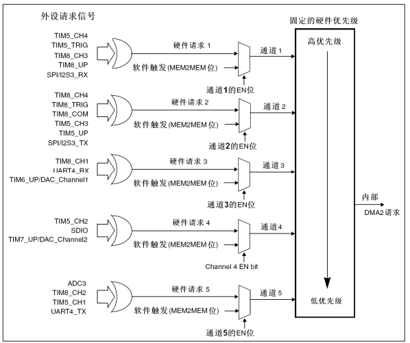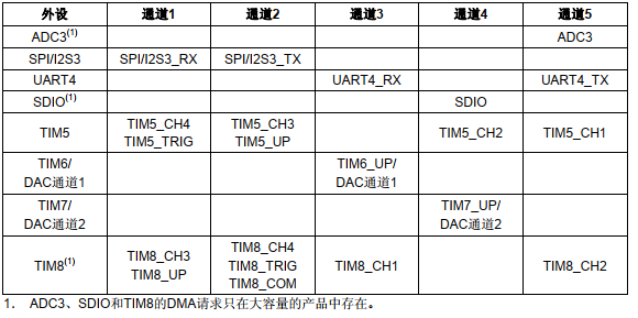 2 SPI/I2S3、 UART4、 TIM5、 TIM6、 TIM7和DAC的DMA请求仅存在于大容量产品和互联型产品