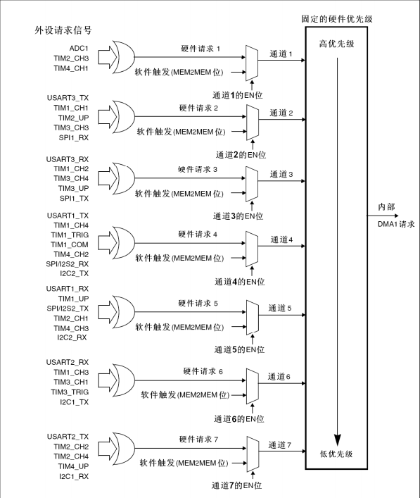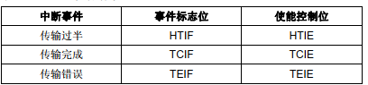 每个DMA通道都可以在DMA传输过半、传输完成和传输错误时产生中断。为应用的灵活性考