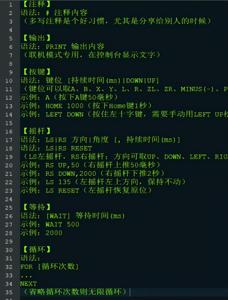 “伊机控”的“简单语法”可以分成6个部分,分别为:注释、输出、按键、摇杆、等待、循环。