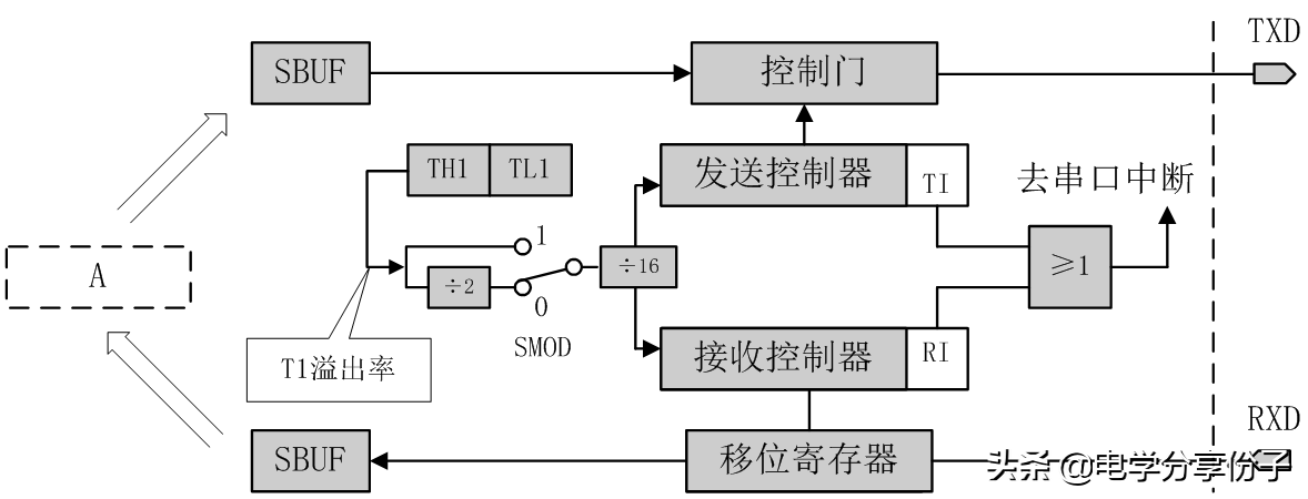 方式2或方式3时为11位数据的异步通信口。TXD为数据发送引脚,RXD为数据接收引脚 。