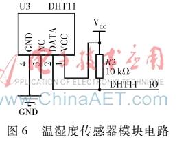为满足设计需要,系统还配备了温湿度传感器DHT11[910],可以检测周围环境的湿度和温度,湿度测量范围:20~95 %RH(0~50℃范围),湿度测量误差:±5%,温度测量范围:0~50℃,温度测量误差:±2℃,以数字量形式输出。DHT11不仅可以适应正常的平衡车的工作环境,而且单总线的设计方式节约了IO口,有助于简化电路设计,设计的电路原理图如图6所示。