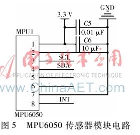 输出完整的9轴融合演算技术。也可以自行进行数据解算,得到稳定的角度值,设计的电路如图5所示。