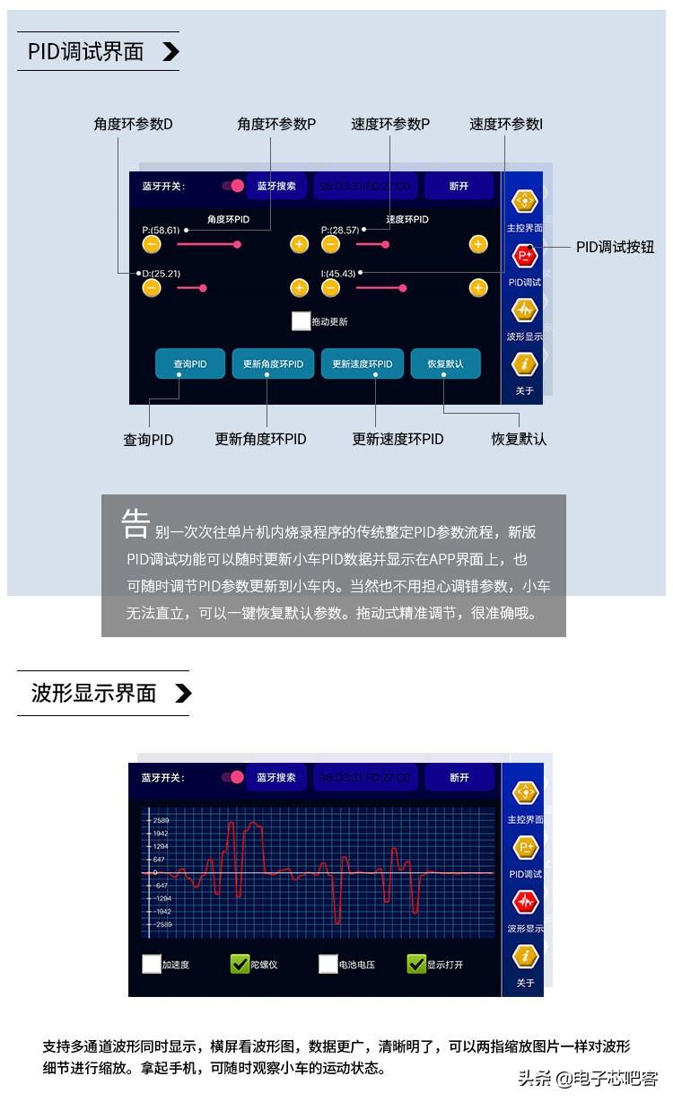 对于平衡车来说最重要的是直立环,所以必须先调节直立环,直立环使用了PD控制器,先调试P参数,从小到大,直到刚开始出现了震荡,增大参数D以消除震荡。速度环使用了PI控制器,参数P可以增强平衡车回中的能力,参数I可以对其进行细调。转向环是保证小车能够水行驶,使用P控制器,逐渐修改参数直到小车可以保持水平,停在原地。
