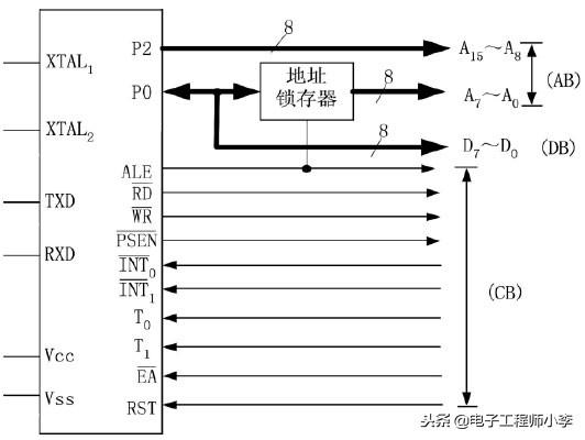 ➢ 数据总线: P0口用作数据总线,数据总线是双向的,既可以由单片机传到外部芯片,也可以由外部芯片传入单片机。