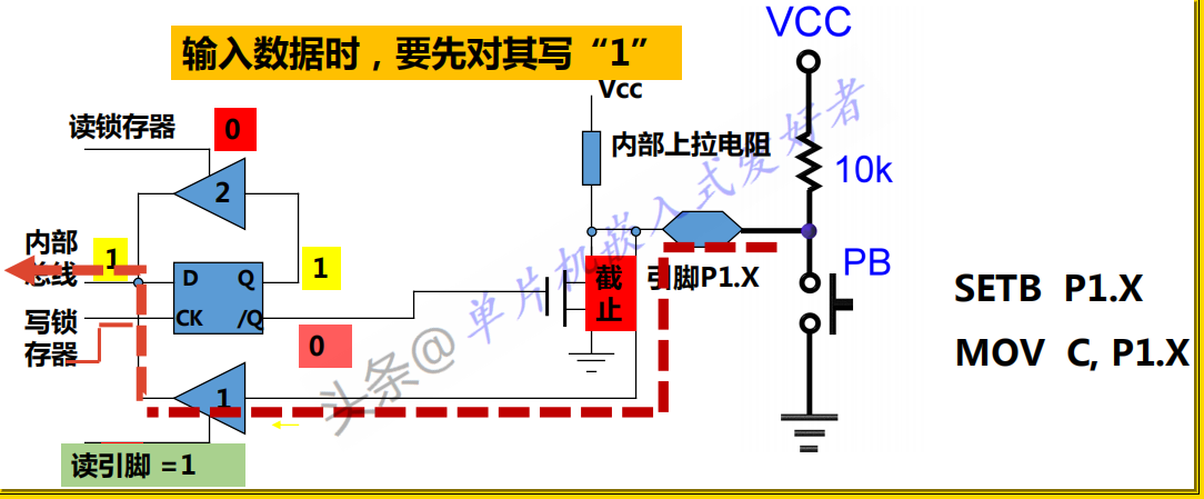 2.当I/O口作为输入时,必须通过程序输出1使内部开关管截止,这样从"管脚Px.x"输入的信号才能在"读管脚"信号的帮助下被正确读走。