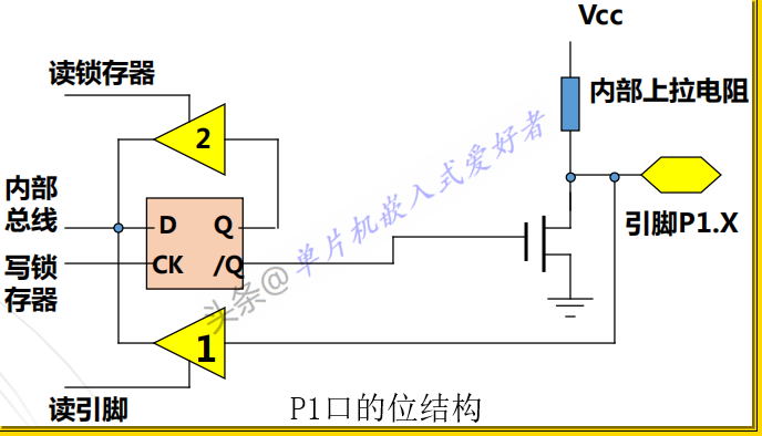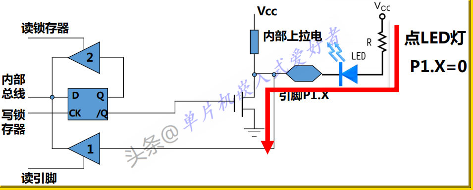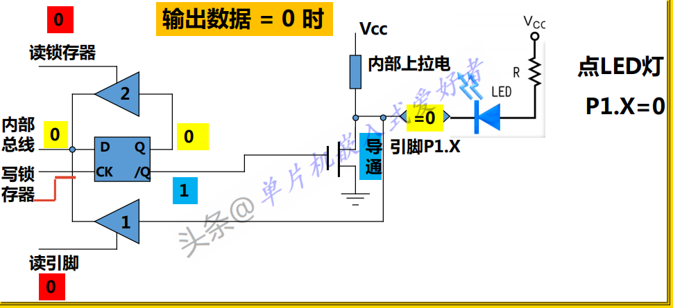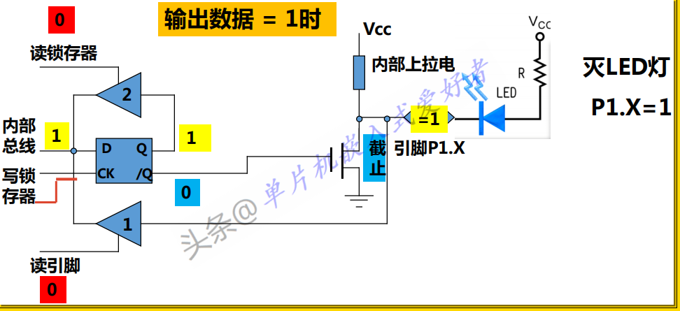 当内部总线输出数据为1时,IO引脚内部开关管截止,IO引脚与地断开,通过内部上拉电阻连接到Vcc,所以Led灭。