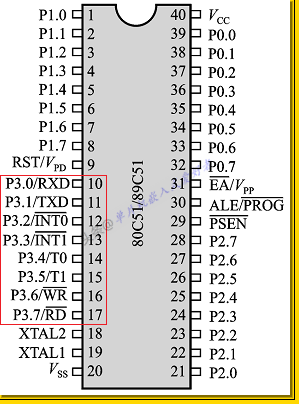 上图是89C51单片机的封装引脚图,89C51单片机有4个IO端口为P0~P3,每个端口有8个引脚,分别对应8个位0~7,每个端口的引脚都可以作为输入输出使用。